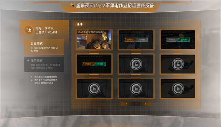 为了给予用户更全面的优质体验,幻威动力针对10kV不停电作业VR课件和体感设备,量身研发了一款培训考核系统,该系统集成了实名制面部识别、VR运行、设备控制、人员管理和智能统计等功能,更具有数据保密、安全性强、UI界面简洁、新人上手快等特点,使智能化培训形成完整闭环,不仅能引导学员自主化培训练习考核,还可以帮助管理人员快速掌握培训动态和成绩反馈,最终达到在智能化加持下极大提高培训效率的目的。
