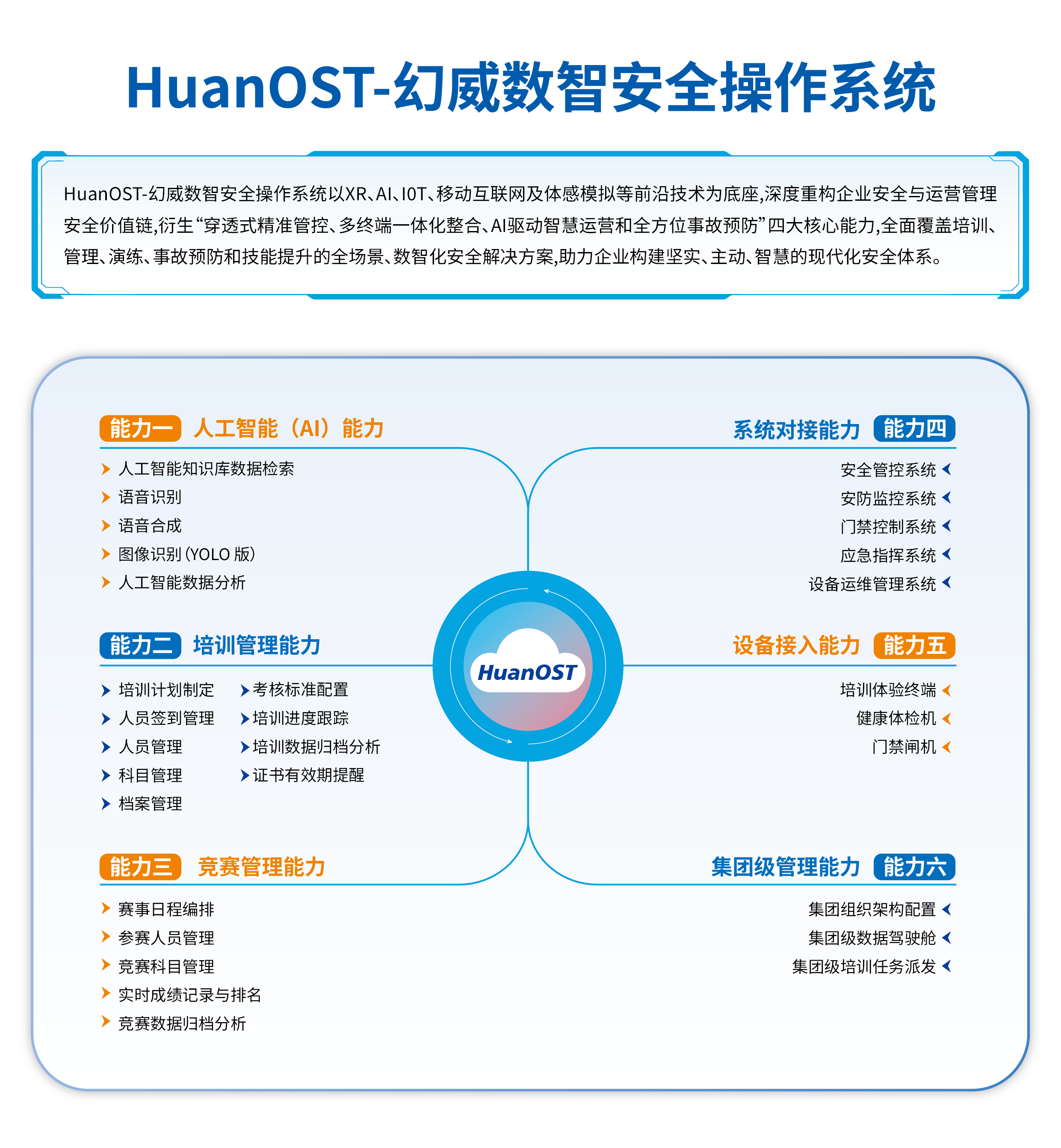 构建“1+6”核心业务体系,以幻威数智安全操作系统(HuanOST)为核心支撑,为企业提供标准化安全培训产品、一站式安全实训基地建设、智慧运营管理平台构建、实战化AI数字应急演练、全方位事故预防、专业岗位技能水平提升六大服务,实现安全培训、应急处置、安全管控的全面智能化升级。