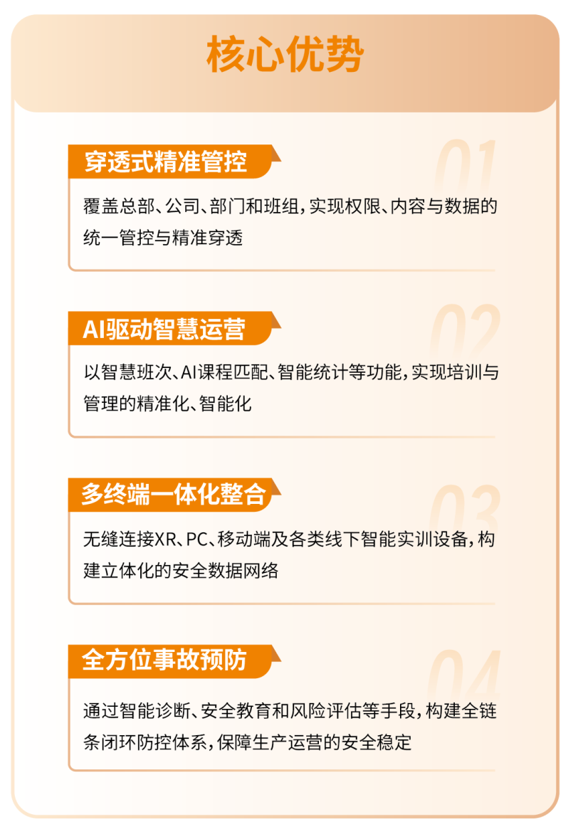构建“1+6”核心业务体系,以幻威数智安全操作系统(HuanOST)为核心支撑,为企业提供标准化安全培训产品、一站式安全实训基地建设、智慧运营管理平台构建、实战化AI数字应急演练、全方位事故预防、专业岗位技能水平提升六大服务,实现安全培训、应急处置、安全管控的全面智能化升级