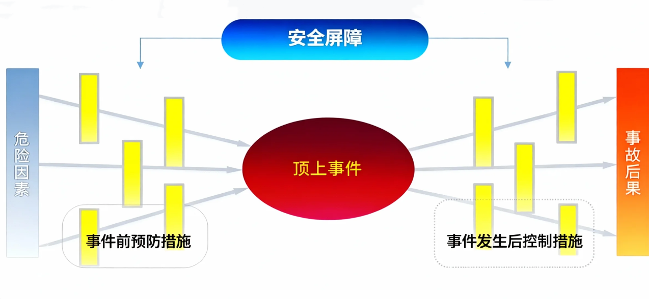 展示事件危害后果关系,示范通过设置屏障来对危险、顶上事件、危害因素和后果加以控制。