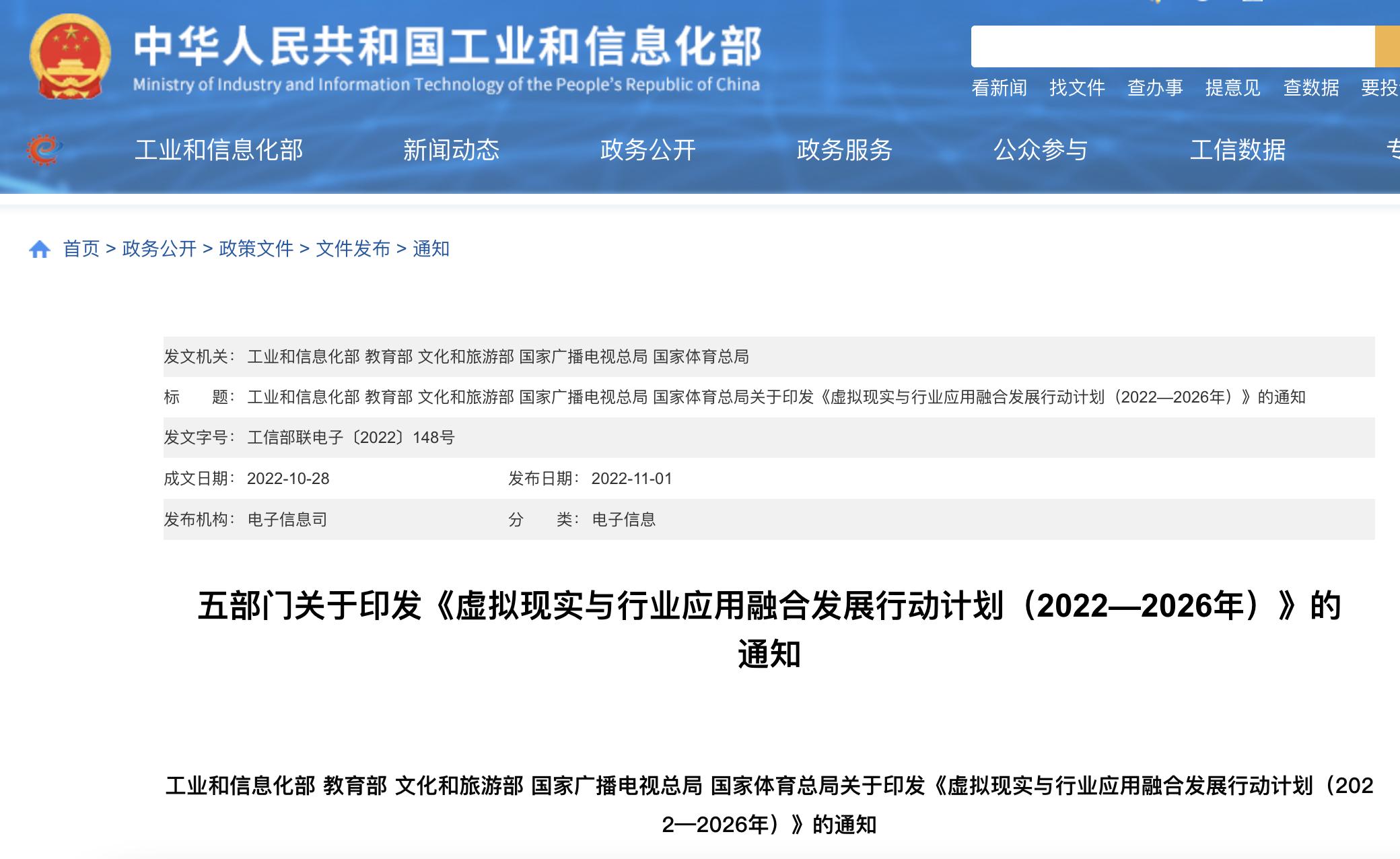 工业和信息化部等五部门联合印发的《虚拟现实与行业应用融合发展行动计划》也明确提出:
