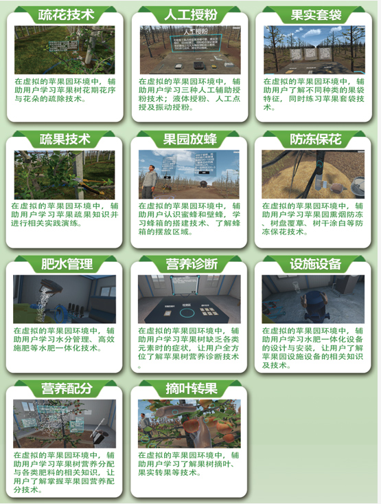 “苹果种植栽培VR实训产品”是主要针对果业生产者和科普大众对果业科技知识的迫切需求,利用成熟、先进的虚拟现实(VR)技术开发的一套具有交互性和沉浸性的高质量的果业科技VR知识服务产品。该产品以苹果树为开发对象,搭配VR头盔、手柄等硬件设备及展示平台,通过全景漫游、切换、关键技术交互与知识讲解,提供苹果树水肥管理和花果管理技术有关的知识服务。该产品弥补了苹果树栽培现场实操的时间、地点、材料损耗的不足,可为用户提供极为真实的农事操作体验,可广泛应用于教学、培训、科普领域,推动果业产业发展。